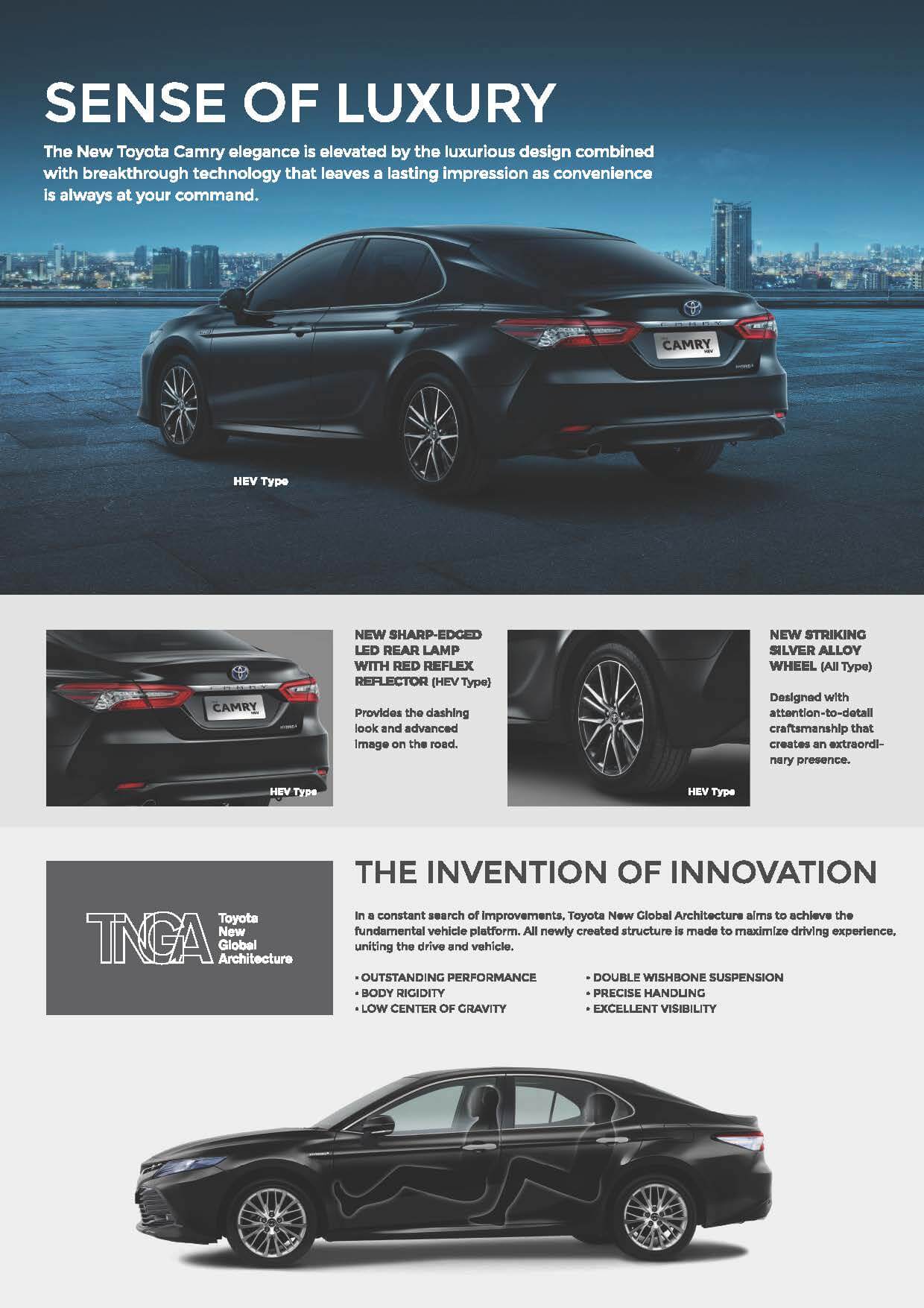 Toyota New Camry, sedan premium terbaik dan ternyaman di Indonesia bagi eksekutif seperti Anda. Ditambah dengan penggunaan platform Toyota New Global Architecture (TNGA), All New Camry menjadi kian nyaman dan dinamis ketika melesat membawa penumpangnya.