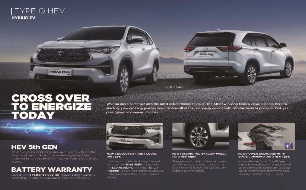 Saatnya menyebrang dengan energi baru The All-New Kijang Innova Zenix yang hadir dengan full model change yang membuat Anda bisa melintas kemana saja dan melampaui batasan apapun. Dengan Teknologi Hybrid baru, Fitur Canggih, desain Crossover dan Fitur Keselamatan, akan menjanjikan Anda kenyamanan, jaminan dan ketangguhan dalam setiap perjalanan indah ke depan.